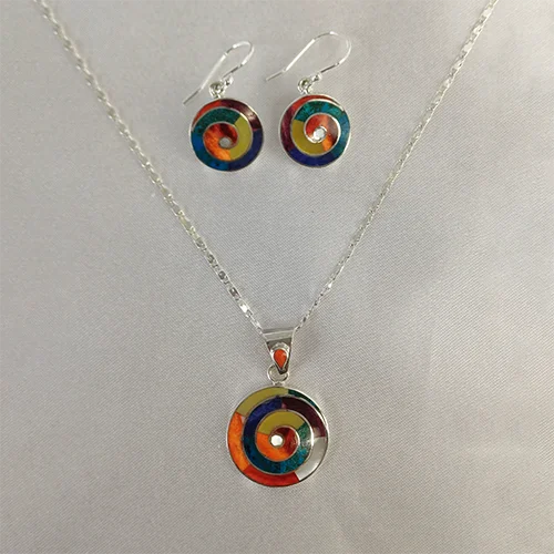 The Spiral Rainbow Set of Earrings and Pendant features vibrant, swirling designs inspired by the colors of the rainbow. This set can symbolize harmony and balance, making it a meaningful addition to any jewelry collection. Perfect for adding a touch of color and spiritual significance to your everyday style.